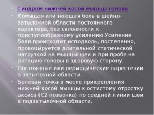 Клиническая картина «синдрома нижней косой мышцы головы» характеризуется ломящей или ноющей головной болью, локализирующейся преимущественно в верхней шейно-затылочной области. Боль обычно постоянная, без наклонности к ярко выраженному приступообразному усилению.